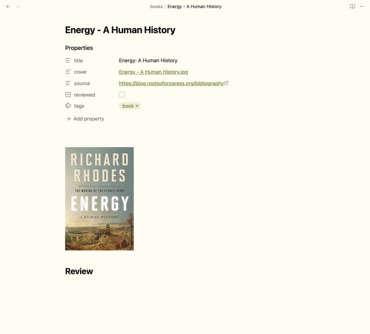 Each link when clicked leads you to a free form book page, where you can add reviews and create wikilinks with other documents in your vault.